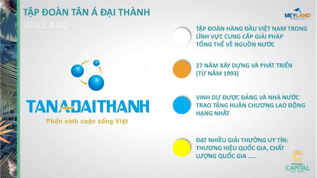 Meyhomes Capital Phú Quốc được phát triển bởi Tân Á Đại Thành, một trong những tập đoàn hàng đầu tại Việt Nam trong lĩnh vực bất động sản và công nghiệp. Với hơn 30 năm kinh nghiệm, Tân Á Đại Thành đã khẳng định vị thế của mình qua hàng loạt dự án lớn trên cả nước.