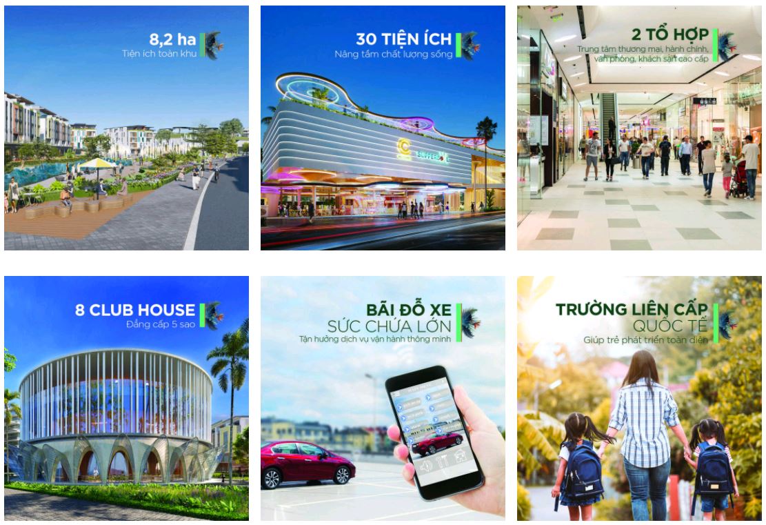 | Tiện ích | Khu thể dục thể thao; trung tâm tổ chức hôi nghị; khu vui chơi dành cho trẻ em; khu thương mại mua sắm; nhà hàng; quán coffee; phòng gym; khu dịch vụ y tế;… |